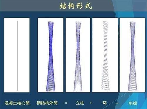廣州塔外部鋼結(jié)構(gòu)體系由24根立柱、斜撐和圓環(huán)交叉構(gòu)成,各立柱間隔相當(dāng),環(huán)形排列。