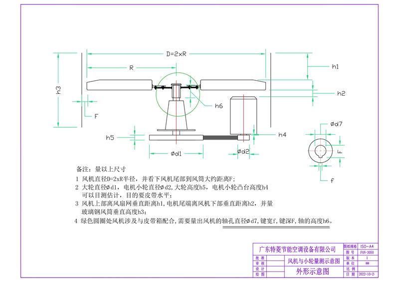 4、綠色圓圈處風(fēng)機(jī)涉及與皮帶箱配合,需要量出風(fēng)機(jī)的軸孔直徑必d7,鍵寬f,鍵深F,軸的高度h6 。